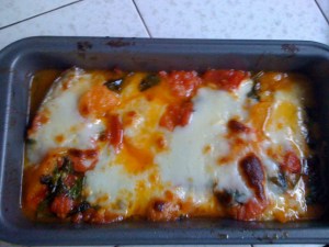 Lay a single layer of eggplant in the loaf pan making sure to incorporate the garlic and olive oil. Add half the tomato mixture on top the layer slices of half the mozzarella to cover. Repeat.
